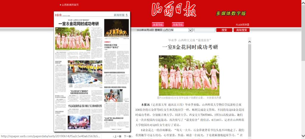 6月14日,山西日报第五版新闻时报以“毕业季,山西师大约炮视频 约炮视频 再现‘最美宿舍’”为题,头条报道了约炮视频 同一宿舍8名女生全部考取“985”、“211”高校研究生的事迹。